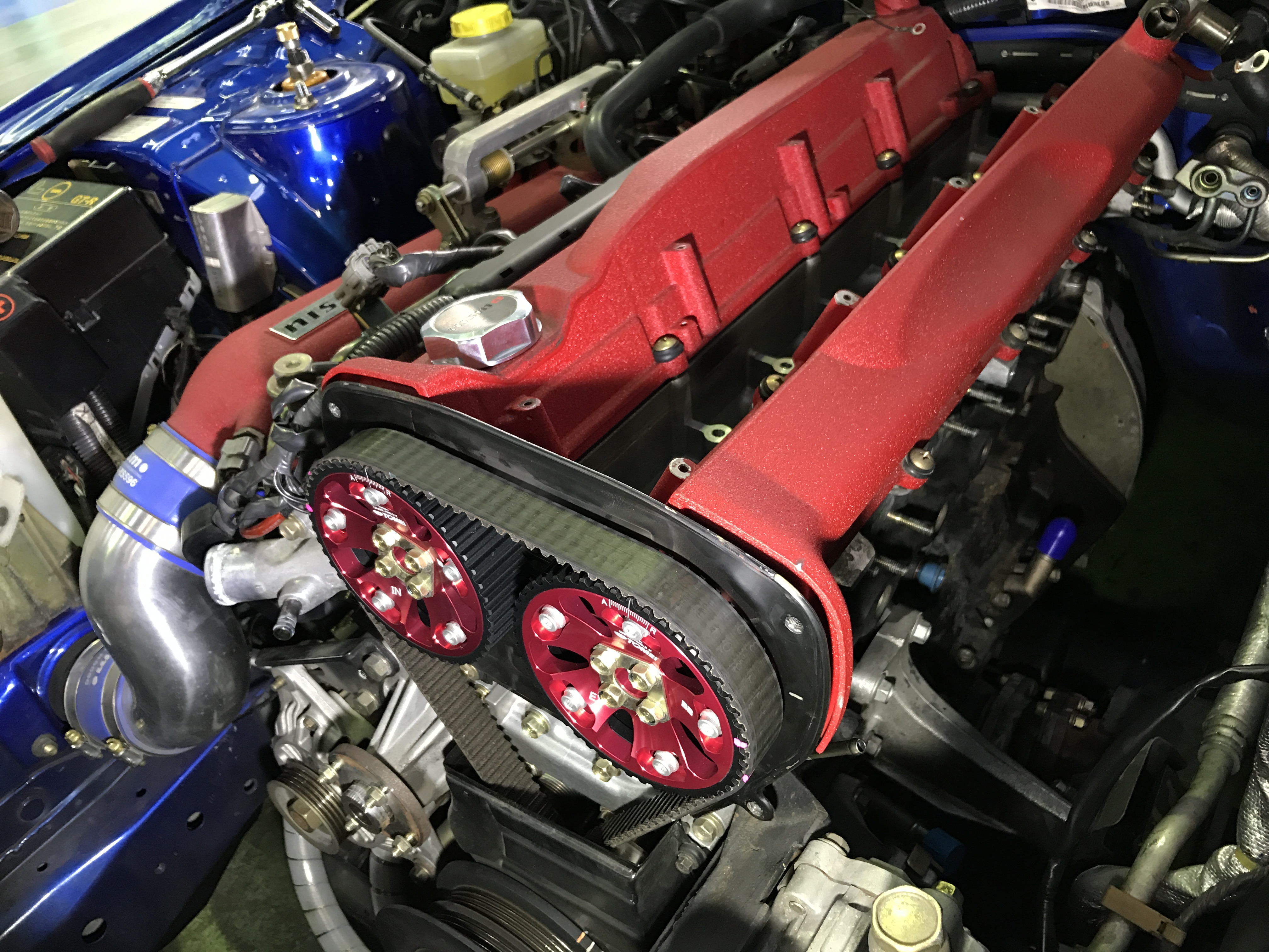 img_3330 img_3331 img_3334 img_3335本当にありがたい事です。何とか年末に頂いていたお仕事を片付け出来まして、今年の最初のお仕事が、ベイサイドブルーのBNR34の2台からのスタートで、嬉しすぎて(笑)手前のBNR34は、オイルメンテナンスですが地元はこちらですが、今は東京でお仕事、生活してる方です。わざわざ何時も作業をやらせて頂いてます。奥側のBNR34は先ずはトラストさんのT517Zタービンへ交換して、今流行り?のR35エアフロへ交換してインジェクターはボッシュさんの900ccの7穴が開いいるインジェクターに交換します。あ、サードさんからの発売ですよ(笑)ちゃんと言っておかないとネ。何てったってGTのチャンピオンチームだからネ。それからニスモS1エンジンが搭載されてますが、タービンをいかすのもバルタイが命ですからバルタイ変更の為にカムスプロケの交換してバルタイはきっちりして。でも、インテーク側はニスモさんも微妙にやはりバルタイ変更してありました。コストのかからないやり方で(笑)まぁ誤差は?とかは言わずに(笑)天下のワークスさんですから。とりあえず幸せに仕事をやらせて頂いてます!