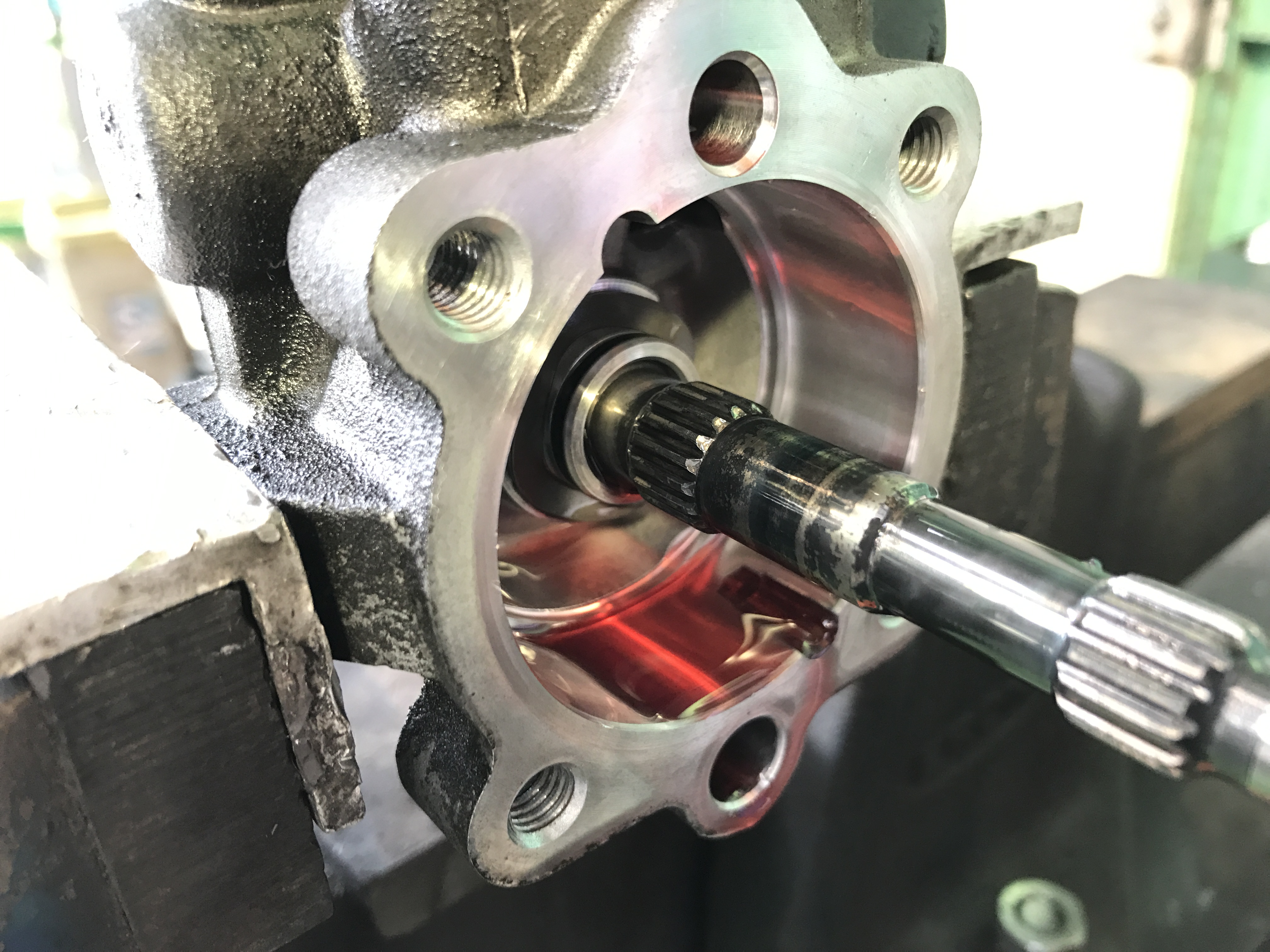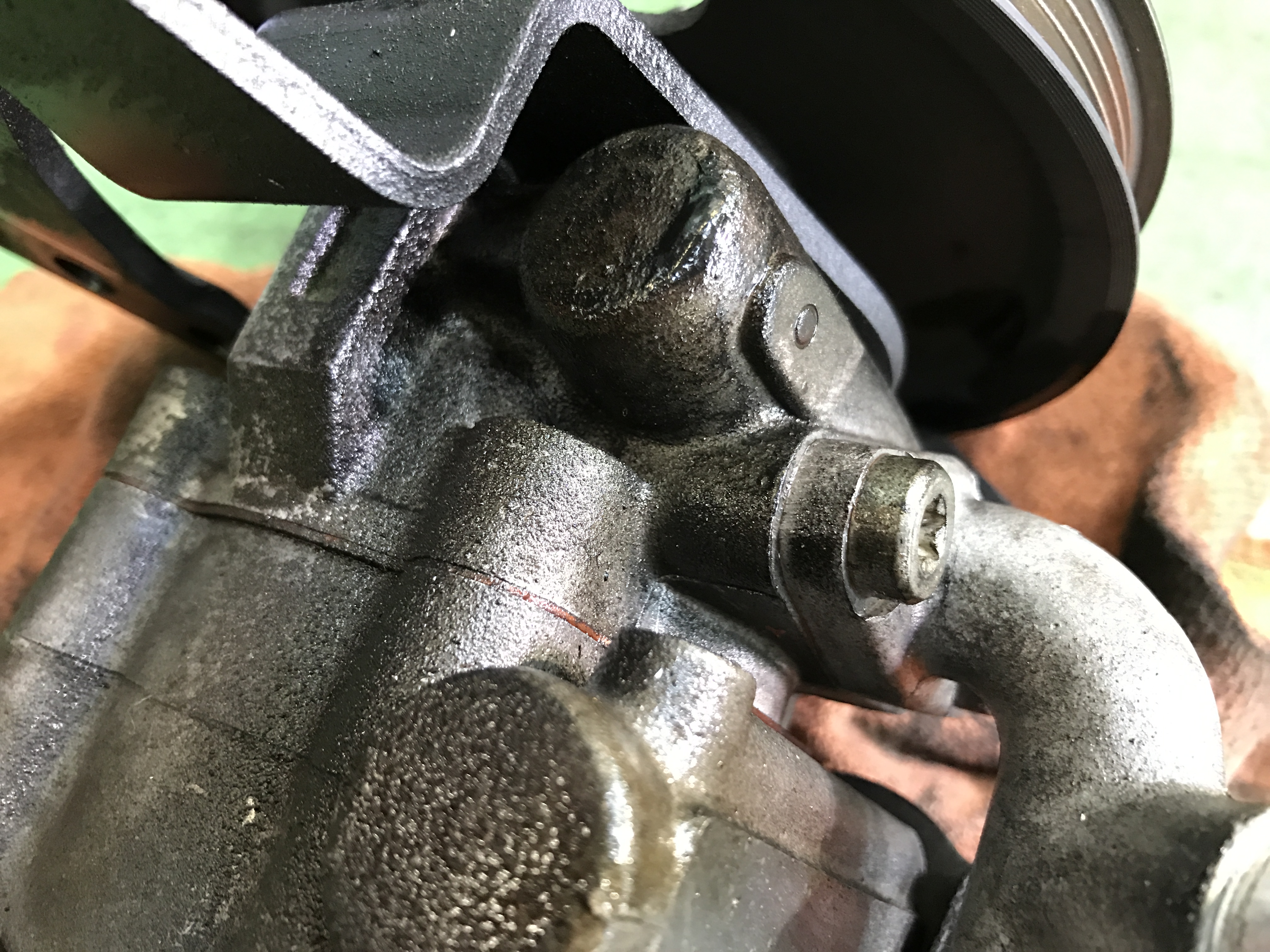 パワステオイル漏れの修理も同時に進行しています、GTRですがR32は、パワステと、ハイキャスの制御が、同じポンプです。ですから、ハイキャス方面のホースからのオイル漏れが、すごくあります。以前にご来店の時にホースより一部漏れてきてましたから、修理交換の予定をしてました。しかし、確認作業に時間をさいていきますと、エアコンのコンプレッサーが、ワインレッドの色をしたオイルで、キラキラしてまして…。辿っていきますと…真上にはパワステポンプ本体がΣ(-᷅_-᷄๑)実は、パワステポンプというのは、不具合があれば、普通はリビルド品への交換ですが、もうこの時代の車ですとありませんでした(泣)新品も無くて、まさかのオーバーホールです。シール類はあと数セットありましたから、慌てて注文して。自分のGTRの時にハイキャス無しにしたから分解した経験が、ありましたから、頑張れました(笑)まだまだ続く…(笑)