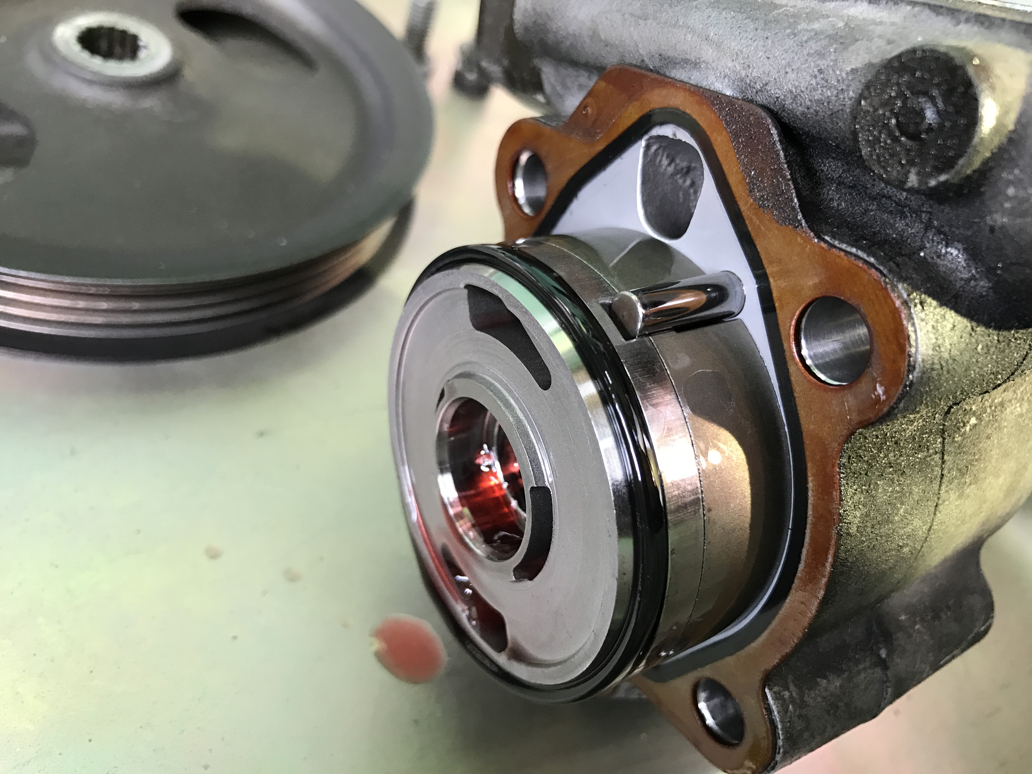 パワステオイル漏れの修理も同時に進行しています、GTRですがR32は、パワステと、ハイキャスの制御が、同じポンプです。ですから、ハイキャス方面のホースからのオイル漏れが、すごくあります。以前にご来店の時にホースより一部漏れてきてましたから、修理交換の予定をしてました。しかし、確認作業に時間をさいていきますと、エアコンのコンプレッサーが、ワインレッドの色をしたオイルで、キラキラしてまして…。辿っていきますと…真上にはパワステポンプ本体がΣ(-᷅_-᷄๑)実は、パワステポンプというのは、不具合があれば、普通はリビルド品への交換ですが、もうこの時代の車ですとありませんでした(泣)新品も無くて、まさかのオーバーホールです。シール類はあと数セットありましたから、慌てて注文して。自分のGTRの時にハイキャス無しにしたから分解した経験が、ありましたから、頑張れました(笑)まだまだ続く…(笑)
