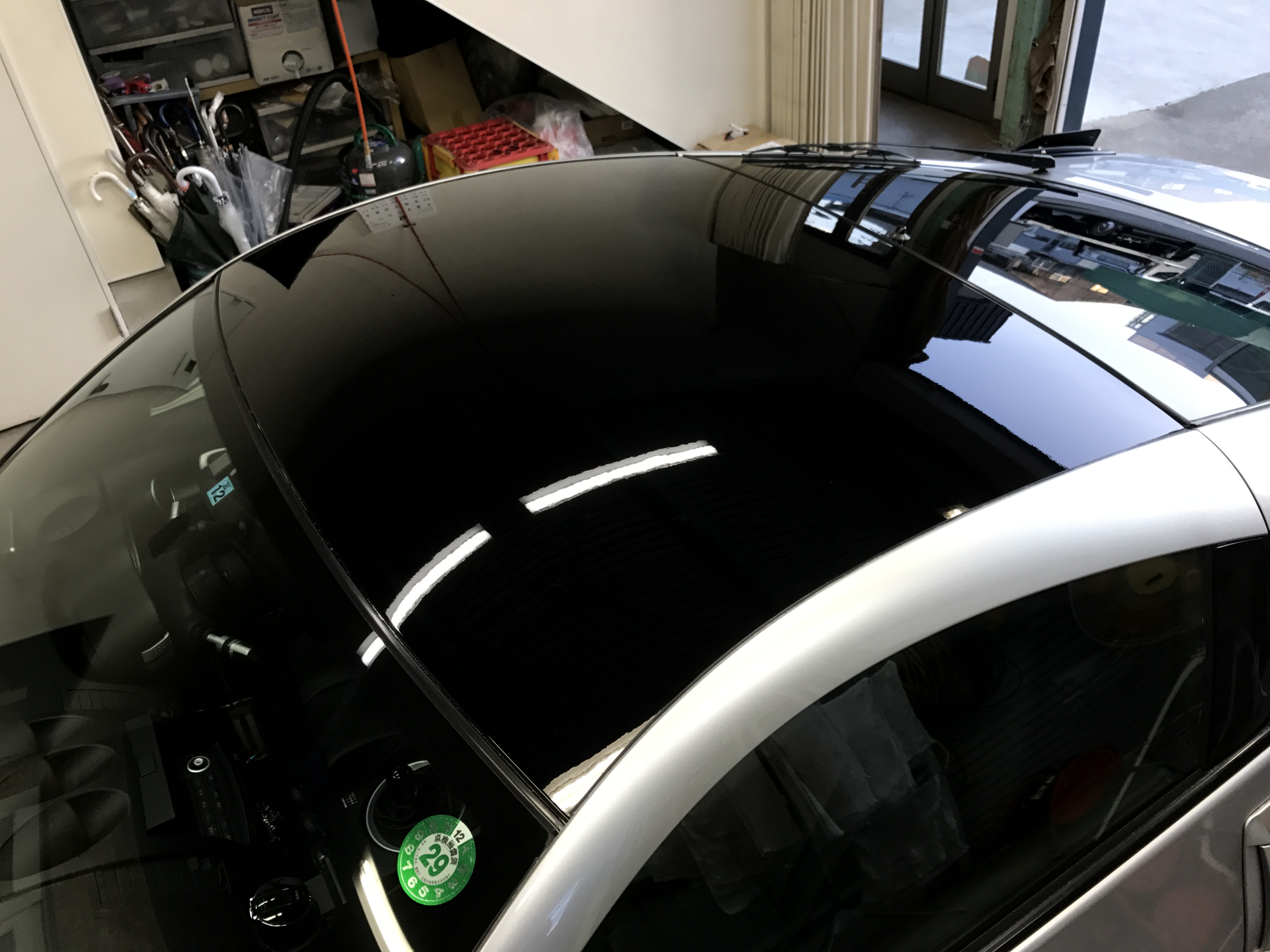 最初は、最近の流行りのカーボンルーフにしたのですが、鈴鹿サーキットを走る車ですから、両面テープではなくて接着にしたのですが、接着剤の硬化が進むにつれて、おかしなカタチに波を打ち始めたので…😭